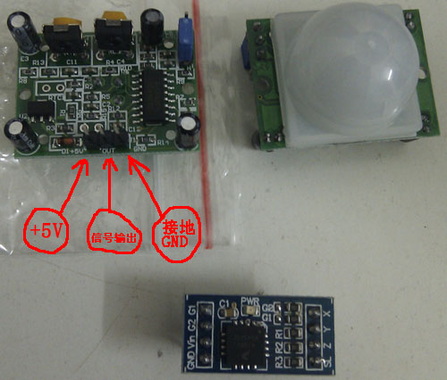下圖是人體紅外熱釋傳感器(上兩個(gè))、飛思卡爾三軸加速器(下)