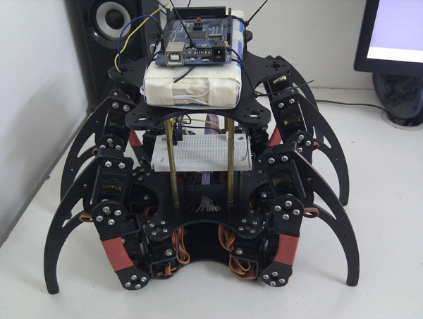 下載完程序,輸入“S”是站起來,呵呵,效果不是很好,可以設置大點的角度。輸入“L”是蹲下。輸入“F”是把所有的腳都抬起來。輸入“0”是0號舵機運動,就是六足機器人的前腳運動。輸入“1”是右腳運動。