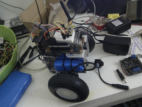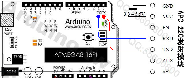 上次用Rboduino I/O Expansion V3.0擴展板插上去才能用APC220發射模塊,后來發現,如果不安裝什么云臺的話,用Expansion V3.0板子有點浪費,還不如用面包版呢!