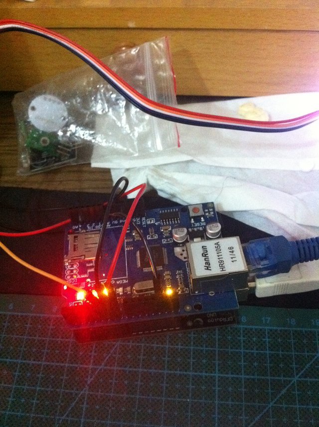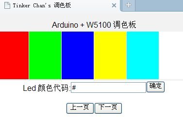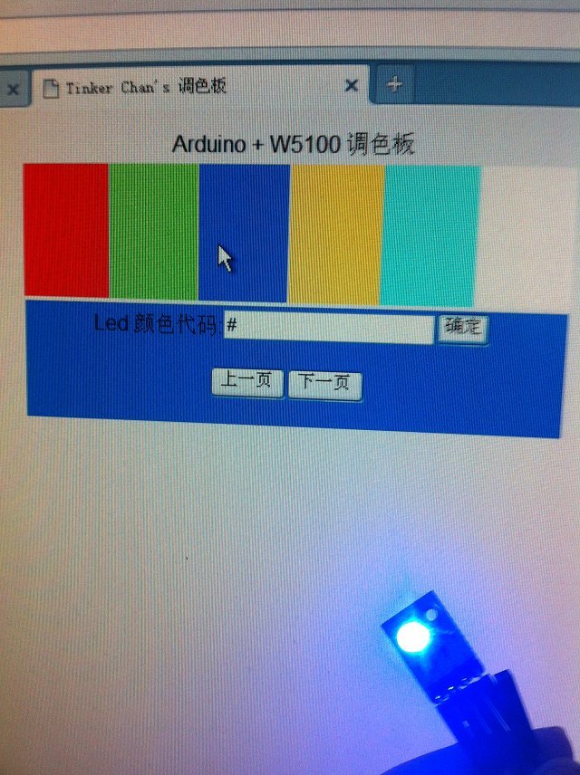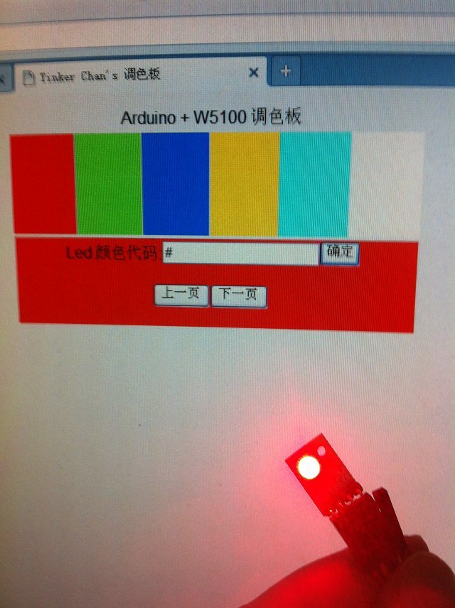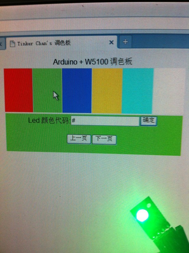 通過Arduino +W5100模塊,組合成WEB服務器,把網頁代碼發送到瀏覽器上,如果點擊調色板上的顏色色塊,利用POST發送顏色代碼值到Arduino上,Arduino通過分析代碼,把代碼轉換成PWM值輸出到對應引腳。