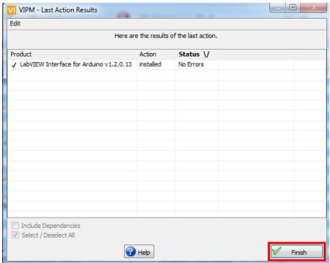 下面主要講解如何安裝LabVIEW Interface for Arduino Toolkit插件。首先,需要安裝VI Package Manager軟件,下載地址http://jki.net/vipm,安裝完成之后,啟動VI Package Manager軟件,在窗口界面中找到Labview Interface for Arduino,點擊 Install &Upgrade Packages 按鈕,然后點擊 Continue 等待軟件下載完成,最后點擊Finish。如圖1至5所示。