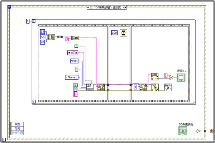 LabVIEW上位機程序框圖如圖4和圖5所示,由于有2路模擬量和2路數字量,此處僅給出一路模擬量和一路數字量的程序框圖。不同通道的模擬量或數字量的發送數據幀中,通道號不同;數字量與模擬量采集的發送數據幀中,命令號不同。發送數據幀中,具體的命令號和通道可以自己定義,不過需要上下位機的對應起來。