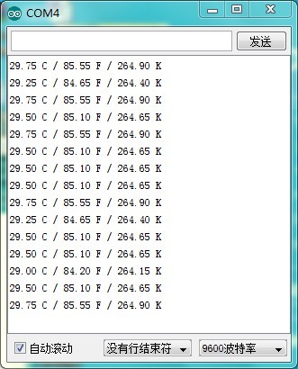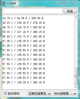 MAX6675的庫文件自帶的串口輸出示例,把采樣間隔改為2s。