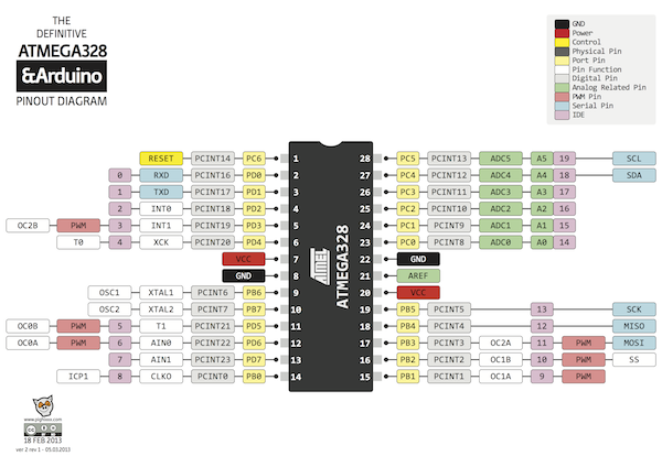 以上對Arduino UNO的介紹摘自網上,通過這些介紹,我們可以知道Arduino UNO的資源分配情況。圖1為Arduino UNO的引腳圖,從圖中我們可以清楚地看出ATmega328P的物理引腳與Arduino所定義的功能之間的關系,從而可以將功能引腳標注出來。