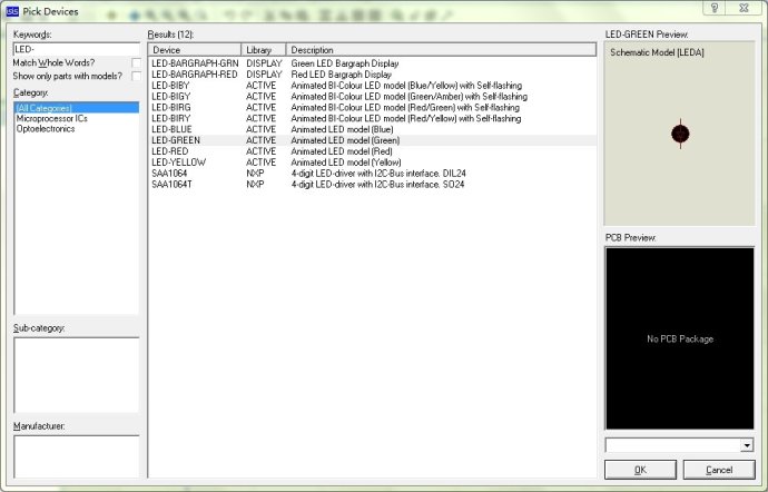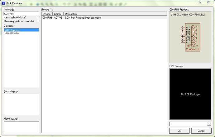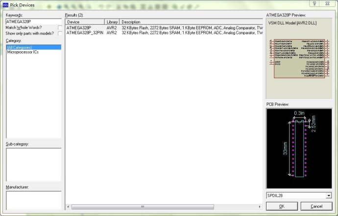 下面我們打開protues 7.10軟件,進入元器件的選擇,在元器件一欄中輸入“ATmega328P”,并選取ATmega328P單片機,如圖2所示。然后,在元器件一欄中輸入“RES”,選取電阻,如圖3所示。接著,在元器件一欄中輸入“LED-GREEN”,選取綠色的LED燈(你也可以選擇紅色或者黃色的),如圖4所示。最后,在元器件一欄中輸入“COMPIM”,并添加到元器件域中,如圖5所示。
