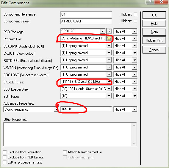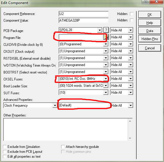 上面的這些工作已經完成了硬件搭建,但是要能正常的進行仿真還需要對仿真環境進行一下設置。首先,更改ATmega328P的參數,單擊ATmega328P單片機,會彈出如圖9所示的設置選框,對標注的地方進行修改,改為如圖10所示的參數。