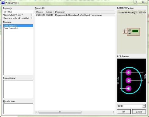 首先,我們需要proteus仿真里面添加DS18B20數(shù)字式溫度傳感器,在元器件搜索欄中輸入“DS18B20”,并添加至元器件選擇欄中,如圖2所示。并將其DQ管腳接至數(shù)字口2腳,也就是ATmega328P的4管腳,同時接10kΩ的上拉電阻,VCC接至+5V,GND接至地端,修改后的Arduino