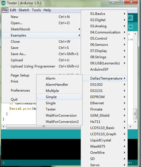 IDE,進入example中的DallasTemperature中選擇simple文件并打開,如圖6所示。