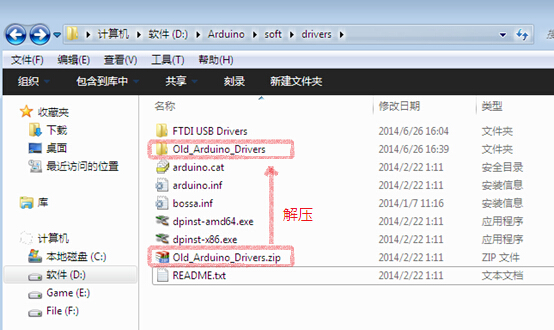 到Aarduino安裝目錄下(例如:我自己的安裝目錄為D:\Arduino\soft),找到drivers文件夾,打開后可以找到一個壓縮文件:Old_Arduino_Drivers.zip,把這個壓縮文件解壓到Old_Arduino_Drivers文件夾中,放在 D:\Arduino\soft\drivers下(橫線部分為自己安裝目錄,根據(jù)自己的安裝目錄自行更改,不再提示)。