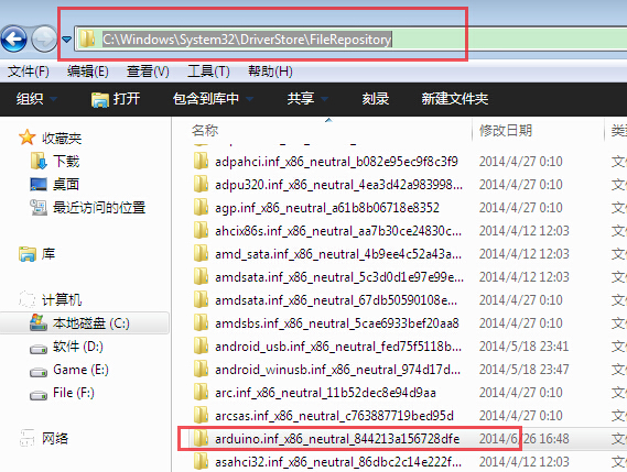 一般情況下,這前半部分目錄地址(C:\Windows\System32\DriverStore\FileRepository)是一樣的,后半部分不一樣,例如我的文件夾名字為arduino.inf_x86_neutral_844213a156728dfe。