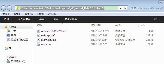 打開這個文件夾,把Arduino UNO REV3.inf、mdmcpq.inf、mdmcpq.PNF、usbser.sys這4個文件復制到這個文件夾中。(如下圖)