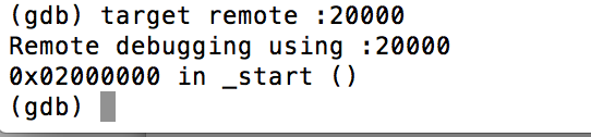 然后會(huì)進(jìn)入GDB命令行。因?yàn)槲覀兊某绦蛐枰虳eSmuME配合調(diào)試,程序本質(zhì)上是在模擬器上運(yùn)行,因此,GDB需要和DeSmuME建立IP連接,所以在GDB命令行中輸入以下命令: