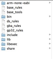 在相應(yīng)目錄下創(chuàng)建devkitPro文件夾,并將解壓后的devkitARM文件夾拷到里面。例如我的Mac OS上創(chuàng)建的路徑如下:/Users/Vincent/Documents/OS_Dev/devkitPro/devkitARM。devkitARM文件夾內(nèi)的內(nèi)容如下圖:
