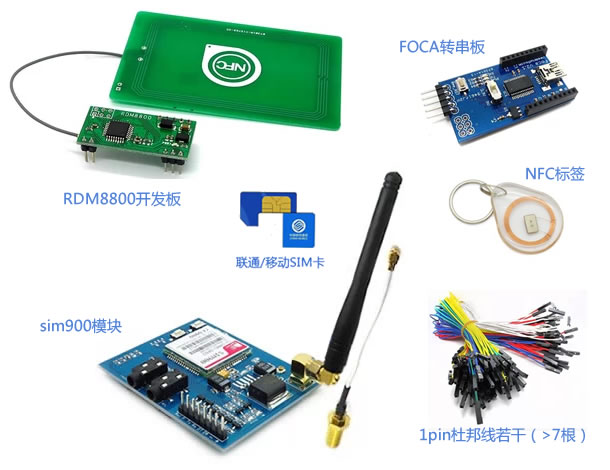 給SIM900模塊裝上SIM卡(僅支持聯通/移動sim卡)和天線,把NFC的天線板連接到RDM8800的接口上,然后插上USB線供電。實物如下圖: