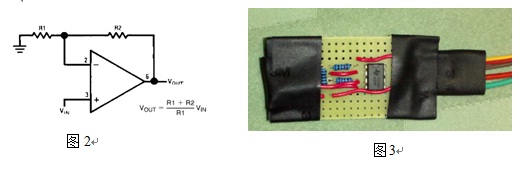 放大電路使用Lm358P集成運放,加上電阻構(gòu)建一個電壓線性放大模塊,原理圖如圖2,自制電壓放大模塊實物圖如圖3所示。