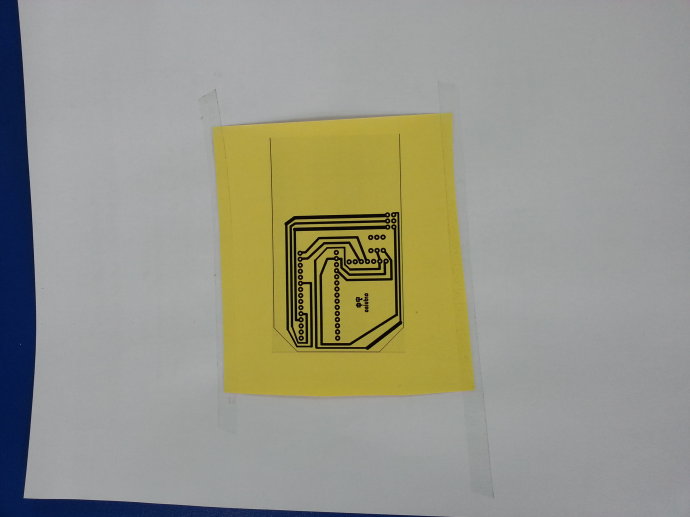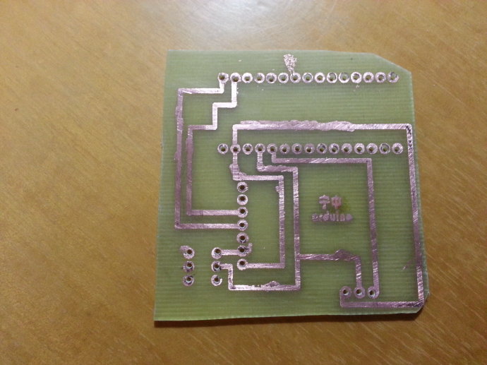 打印完后將熱轉印紙倒復在覆銅板上,然后拿電熨斗壓在上面,小心移動,熨斗溫度要高點,不然很難整個轉印上去。轉印后的覆銅板忘記拍照了......如果有什么斷線的用記號筆補一下,就是用那種寫著防水的記號筆。然后放在三氯化鐵溶液里泡著,具體濃度多少我也搞不清楚,反正就用水調了一些。等銅化掉后就成了,看看我做的: