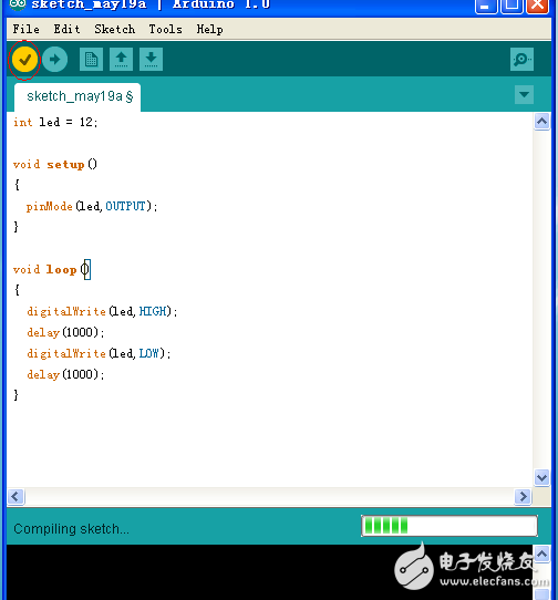 首先電路連接不變,還是使用下載bootloader的線路。然后確保你使用的IDE是Arduino 1.0(在Arduino的官網(wǎng),一進下載軟件頁面的就看得見了),然后選擇板子,還是和上面一樣,ATmega 8-16PU可以直接用;“ATmega 8A-PU”和“ATmega 8PU-8PU”請先改造程序,然后寫代碼(我寫了一個LED閃爍的程序來測試)。