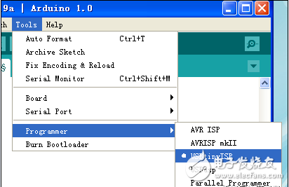 最后是下載,大家可以看一下,在tools下新增加了一個“Programmer”,點開后選擇USBtinyISP,Serial Port就不用選擇了。