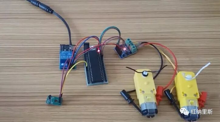 01 準備材料 物聯網開關、51單片機、8050三極管、兩個電機、2路電機驅動模塊 02 接線 將電流電機驅動板正負極接到物聯網開關的正負極(給驅動板通上電)。驅動板的B-1A、B-1B分別接到單片機的P00、P01,驅動板的A-1A,B-1B分別接到單片機的P02、P03。單片機電源接口接到物聯網開關電源輸出端口(給單片機接上電源)。物聯網開關與51單片機通信的話須要用個三極管作為一個通信轉接。三極管C極接到單片機的P32,B極接到物聯網開關的多功能輸出接口(數據輸入)。E極接到物聯網開關負極。 通上電,此接的是5V電源。效果圖如下: 03 網絡配置 首次使用物聯網開關須配置wifi,具體操作請看前面章節。如果物聯網開關已配置,請跳過此步驟。 04 物聯網管理平臺 預先添加好設備(具體操作請看前面章節)。點擊右上角的工具按鈕,彈出對話框,在對話框中找到IO03(R)選擇“單線通信”,面板樣式選擇“用戶自定2”,然后點擊保存,退出對話框。最后再次點擊中間刷新按鈕。 這時就會在設備界面上多了個IO03波形圖標,點擊圖標。 彈出對話框,對話框中我們可以看到有四條滑動條。第一條為方向,第二條為速度。這個方向有八個命令。也可自定命令,具體程序代碼放在公眾號“紅納里斯”,回復“直流電機”即可獲取。 現在我們用這個命令來做演示,在方向條滑到96時,電機轉動方向為反方向。拖動速度條,這時速度也發生變化。 當滑動方向條為32時,一個電機停止,另一個電機轉動。 大家也可以加入我們的QQ群互相學習,討論。 關注微信公眾號:紅納里斯 學習交流①群:203847769 學習交流②群:463316893