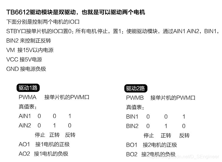 本來我們直接給電壓,電機就會轉,現在我們通過控制電壓,讓他一會有輸出,一會不輸出。假設占空比為50%,也就是說,在一定時間內,電壓有一半的時間是閉合的,一半的時間是打開的,這樣求出來的平均電壓值應該是原電壓值的一半。(不相信的同學可以一會試試,我后面把代碼傳上來)這樣我們就能控制電壓了。但是只控制電壓還不行呀,單片機引腳不能直接接到電機上呀,這就需要電機驅動器了。 TB6612直流有刷電機驅動