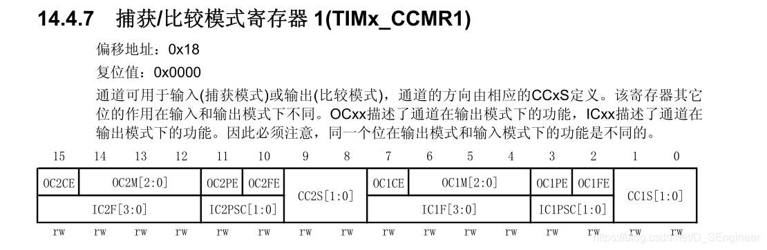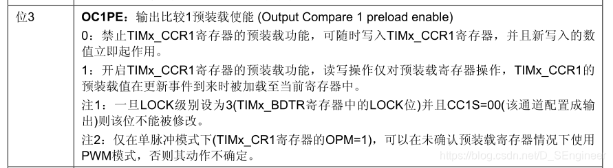 TIM_OC1PreloadConfig(TIM2,TIM_OCPreload_Enable); 進入到函數主題 void TIM_OC1PreloadConfig(TIM_TypeDef* TIMx, uint16_t TIM_OCPreload){ uint16_t tmpccmr1 = 0; /* Check the parameters */ assert_param(IS_TIM_LIST8_PERIPH(TIMx)); assert_param(IS_TIM_OCPRELOAD_STATE(TIM_OCPreload)); tmpccmr1 = TIMx->CCMR1; /* Reset the OC1PE Bit */ tmpccmr1 &= (uint16_t)~((uint16_t)TIM_CCMR1_OC1PE); /* Enable or Disable the Output Compare Preload feature */ tmpccmr1 |= TIM_OCPreload; /* Write to TIMx CCMR1 register */ TIMx->CCMR1 = tmpccmr1;}中文手冊中的寄存器說明
