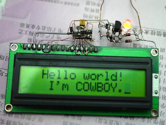 上次在51hei論壇發(fā)了個人肉驅(qū)動LCD1602的帖子,沒什么技術(shù)含量,居然得褲子,有點不好意思,正好這幾天有點時間,于是就再做一個小試驗,用盡量少的IO來驅(qū)動1602,以適應在某些引腳較少的MCU,如Tiny系列等。廢話少說,先上圖,如果大家覺得有意思請起個哄...