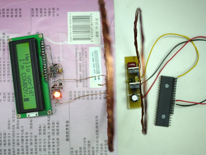 這是接收部分和解調(diào)部分,接收到的高頻電磁波穩(wěn)壓后給LCD1602供電,左側(cè)的芯片是HC595,串并轉(zhuǎn)換用,焊得很丑陋~~~