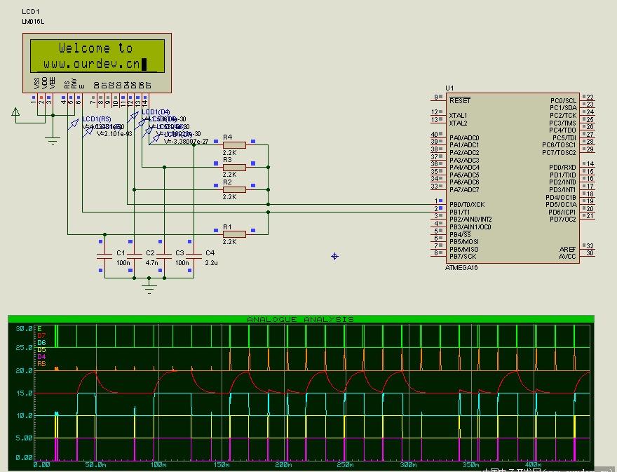 大多數(shù)人會有疑問,就那么幾個阻容,能可靠工作嗎?我也考慮了這問題,在實際的應用中,常?吹綌(shù)據(jù)線上都有小電阻與小電容組成的低通濾波網(wǎng)絡來提高數(shù)據(jù)傳輸?shù)目煽啃。這里的RC用法類似,選用更大的RC,理論上對抵抗外界EMC干擾更有效,設計上只要保證時鐘脈沖的下降沿時刻,各數(shù)據(jù)線的上電平符合LCD1602的要求(VH>4V,VL<1V)。實際測試表現(xiàn)如何?用了簡單的方法進行模擬:1.不斷發(fā)送數(shù)據(jù),然后打通手機瞬間,把手機天線緊靠數(shù)據(jù)線,未發(fā)現(xiàn)異常。 2.用工作中的示波器信號線的地線,不斷觸碰LCD1602相關(guān)引腳,也未發(fā)現(xiàn)異常。當然這種測試并不規(guī)范,所以這種驅(qū)動方式玩玩可以,用在產(chǎn)品上還得慎重考慮。