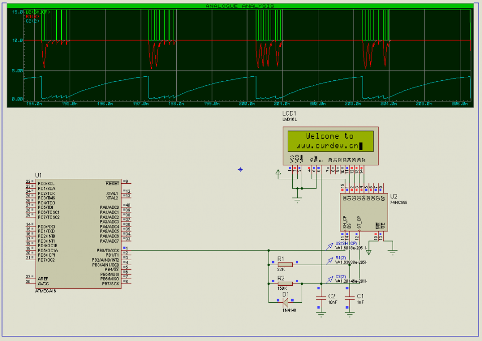 要用無線傳送數(shù)據(jù),要解決單個信道串行傳送數(shù)據(jù)問題,由于樓主位的驅(qū)動方式用兩個I0驅(qū)動LCD1602,用兩通道無線傳輸較復雜。所以,這里要先解決一個IO驅(qū)動LCD的問題。下圖是一個IO通過74HC595轉(zhuǎn)換后驅(qū)動LCD的原理圖,單線的關(guān)鍵原理基本上還是利用了不同RC常數(shù),把串行數(shù)據(jù)、時鐘、鎖存信號混合一起傳送。觀察各點的波形圖可以大致看出其工作的詳細情況。