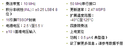 滿量程輸出電流由所施加的外部基準輸入電壓(VREF)決定。與外部電流至電壓精密放大器配合使用時,集成的反饋電阻(RFB)可提供溫度跟蹤和滿量程電壓輸出。