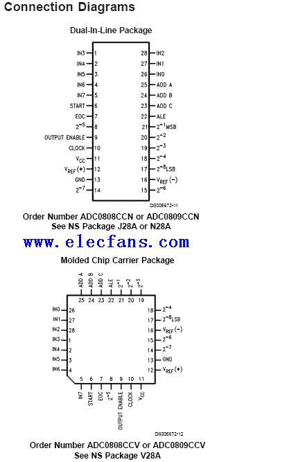 adc0809芯片管腳功能介紹如下圖,兩種形式的封裝均有: