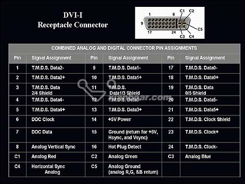 DVI接頭有三種,分別是DVI-Digital(DVI-D)、DVI-Analog(DVI-A)跟DVI-Integrated (DVI-I),DVI-Digital(DVI-D)只有支持數字顯示的設備 、DVI-Analog(DVI-A)只有支持模擬顯示的設備,DVI-Integrated (DVI-I)則是支持數字顯示跟模擬顯示。之所有會有這樣的搭配,因為DVI雖然是為了數字顯示設備所訂定的標準,但是因為透過數字的傳送不會降低畫面的效果,再加上為了考慮能夠轉換成模擬訊號,所以才會有DVI-D、DVI-A跟DVI-I這三種接頭,其中DVI-I可以相容DVI-D裝置(包括連接線),但是DVI-D接頭卻不能夠使用DVI-I連接線,所以大家會看到數字顯示設備是DVI-D的接頭,連接線是DVI-I的接頭,顯示卡是DVI-I的接頭。且DVI-I也可轉接成為D-sub 15pin。下面介紹dvi接口定義圖 DVI-A DVI-D DIV-I接口圖片以及區別