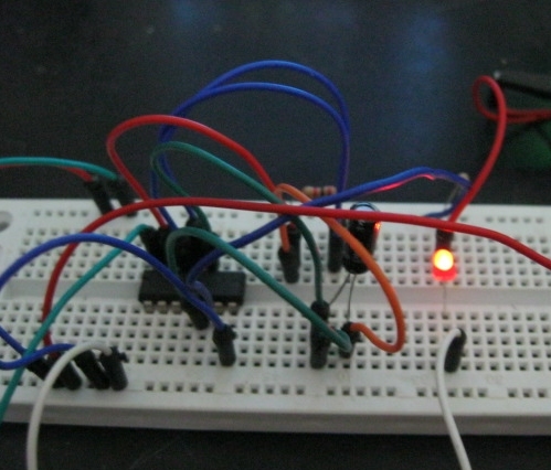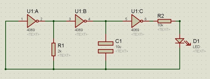 工作原理:假設非門B輸出高電平,由于電容C1兩端電壓不能突變,則非門A輸入也為高電平,非門A輸出為低電平,則非門B輸入也為低電平,則非門B輸出為高電平,此時保證非門B輸出脈沖為高電平,隨著C1電容的充電,C1充得上正,下負的電壓,電容下端的負電壓使得非門A 的輸入電壓下降,當電壓下降到非門關斷電壓時,非門A輸出高電平,則非門B輸出低電平,由于非門A輸出高電平,則給電容進行反向充電,先是原先的上正下負和下正上負電荷中和,然后電容C1充成,下正上負的電壓,當下正電壓上升到使非門A開門電平時,非門A輸出低電平。如此反復循環,產生方波.發光二極管出現閃失.