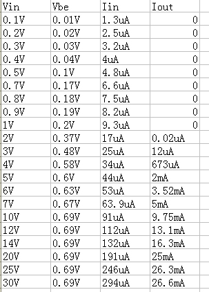 輸 入輸出特性:當Vbe電壓小于0.69V時,輸入電流基本上很微弱,而且輸出電流幾乎沒有,即三極管沒有導通,當三極管Vbe到達0.69V時,三極管導 通,輸入電流和輸出電流放大倍數是:107,116,123,130,106,90......放大倍數基本在100附近,輸出電壓Vce隨著輸出電流的 增大而減少.,剛開始的時候Iout很小,此時Vce很大,三極管處于截止區,當iout變到很大的時候,Vce減少很多,三極管處于飽和區,三極管開關 量就是利用飽和區.