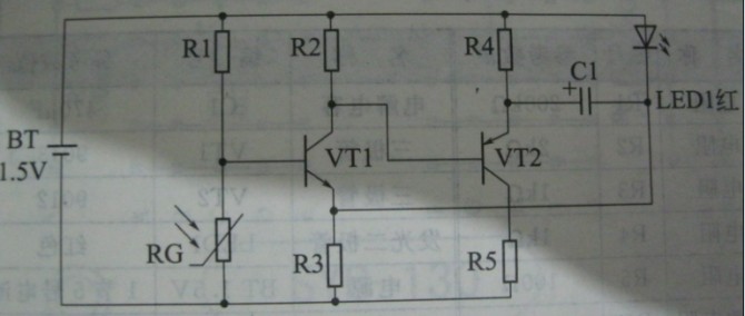 電 路原理: 圖中VT1,VT2組成互補型超低頻振蕩器,振蕩依靠電容C1正反饋完成,當光線亮時,光敏電阻阻值變小,VT1基極電位降低,VT1截止,振蕩器停止工 作,發光管不工作,當在夜間沒光線暗時,光敏電阻阻值變大,VT1基極電壓增大,導通,振蕩器開始振蕩.VT2此時就處于導通和截止交替狀態,當VT2截 止時,電源通過R4,R3向C1充電,其獲得:左正右負電壓,其電壓接近電源電壓1.5V , 當VT2導通時,電容C1通過VT2的發射極,集電極間和電源疊加向LED放電,此時LED獲得接近3V電壓而發光,VT2導通和截止的交替就是LED閃 閃發光..