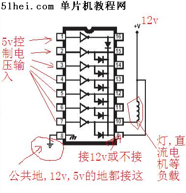 ULN2003 工作電壓高,工作電流大,灌電流可達500mA,并且能夠在關態時承受50V-95V 的電壓,輸出還可以在高負載電流并行運行。ULN2003 采用DIP—16 或SOP—16 塑料封裝。