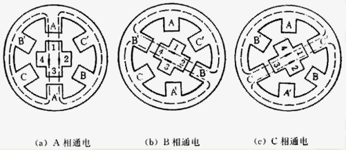 當A相通電時,產生A-A1軸線方向的磁通,并通過轉子形成閉合回路。這時候A、A1就成了電磁鐵的N、S極。在磁場的作用下,轉子總是力圖轉到磁阻最小的位置,也就是要轉到轉子的齒對齊A、A1極的位置,也就是說轉子的1、3會對著定子的A、A1(圖a);