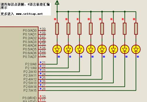 如下圖,如果你在你自己的仿真軟件PROTEUS 上看到單片機P2 口控制的8 個LED 先亮延
