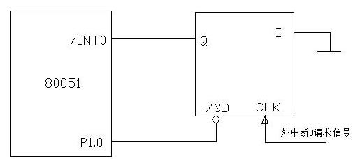 從圖可以看出,外部中斷0請(qǐng)求信號(hào)在D觸發(fā)器(可選用74LS74)的時(shí)鐘輸入端。當(dāng)外部設(shè)備有中斷請(qǐng)求信號(hào)(為低電平)出現(xiàn)時(shí),Q端輸出為低電平,/INT0有效,向CPU發(fā)出中斷請(qǐng)求信號(hào)。CPU響應(yīng)中斷后,在中斷服務(wù)程序中由軟件安排1個(gè)低電平中斷應(yīng)答信號(hào),從P1.0送至D觸發(fā)器的/SD(置位端,低電平有效),使D觸發(fā)器的Q端輸出為高電平,從而撤除了低電平的外中斷0請(qǐng)求信號(hào)。/SD端所需的低電平可通過(guò)在中斷服務(wù)程序中增加一下指令的得到: