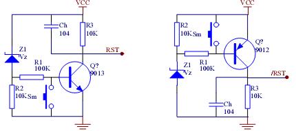 單片機復位電路的基本功能是:系統上電時提供復位信號,直至系統電源穩定后,撤銷復位信號。為可靠起見,電源穩定后還要經一定的延時才撤銷復位信號,以防電源開關或電源插頭分-合過程中引起的抖動而影響復位。圖1所示的RC復位電路可以實現上述基本功能,圖3為其輸入-輸出特性。但解決不了電源毛刺(A 點)和電源緩慢下降(電池電壓不足)等問題 而且調整 RC 常數改變延時會令驅動能力變差。左邊的電路為高電平復位有效 右邊為低電平 Sm為手動復位開關 Ch可避免高頻諧波對電路的干擾