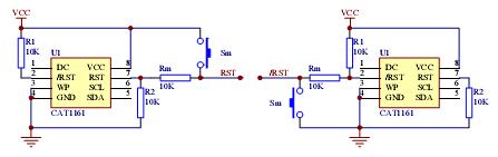 使用時注意的是 RST,/RST 引腳是 I/O 腳,CAT1161 檢測到兩引腳中任何一個電壓異常都會產生復位信號,與 RST /RST 引腳相連的下拉電阻 R2 和上拉電阻 R1 必須同時連接,否則CAT1161將不斷產生復位!同樣不需要手動復位功能時可節省Rm和Sm兩個元件。