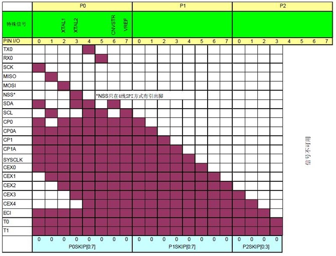 寄存器XBR0、XBR1用來分配引腳給內部數字資源,收到PxSKIP寄存器的影響,分配優先級見下圖: