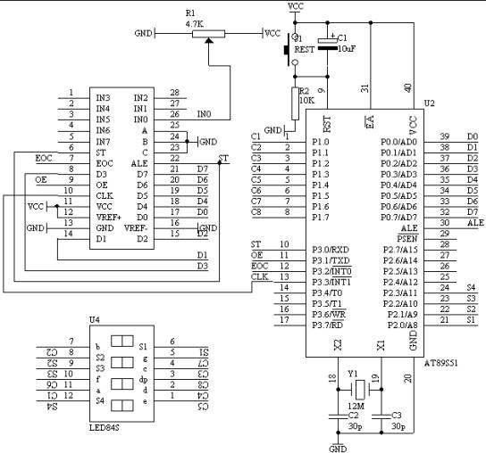 利用單片機AT89S51與ADC0809設計一個數字電壓表,能夠測量0-5V之間的直流電壓值,四位數碼顯示,但要求使用的元器件數目最少。