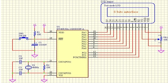 HT48R50A-1 的端口A接到字符型LCD的D0-D7(數(shù)據(jù)總線),使用字符型LCD的8位數(shù)據(jù)接口。