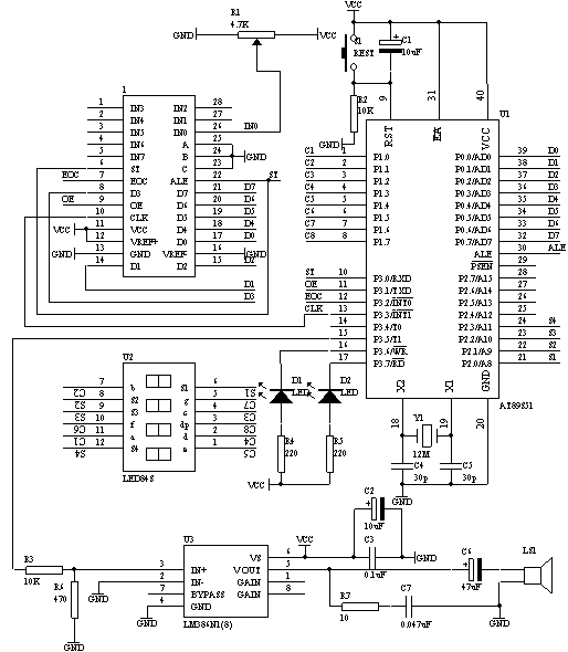 用可調(diào)電阻調(diào)節(jié)電壓值作為模擬溫度的輸入量,當(dāng)溫度低于30℃時(shí),發(fā)出長(zhǎng)嘀報(bào)警聲和光報(bào)警,當(dāng)溫度高于60℃時(shí),發(fā)出短嘀報(bào)警聲和光報(bào)警。測(cè)量的溫度范圍在0-99℃。