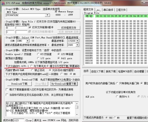 3.這個下載器支持的最低波特率為:1200bps、2400bps、4800bps這三個波特率,下載前請確定上位機的最低波特率是這三個的其中一個。由于程序設計的不是太完美,有時程序不能正確檢測到上位機發送過來的下載信號,此時需要按手動下載按鈕K2完成下載。