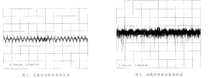 輸出電壓精度的測(cè)試結(jié)果見表1,從表1可知,該電源無(wú)論是空載、輕載還是滿載輸出電壓的精度均比較高,輸出電壓的誤差<0.1V。而輸出電壓紋波的測(cè)試結(jié)果見圖3及圖4。從圖中可知,空載時(shí)輸出電壓的紋波峰峰值較小,約為20mV左右;滿載時(shí)輸出紋波會(huì)變大一些,峰峰值約為50mV左右。但總的來(lái)說(shuō)該電源的輸出電壓的紋波較小,輸出特性良好。
