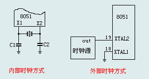 ·Pin18:時(shí)鐘XTAL2腳,片內(nèi)振蕩電路的輸出端。 8051的時(shí)鐘有兩種方式,一種是片內(nèi)時(shí)鐘振蕩方式,但需在18和19腳外接石英晶體(2-12MHz)和振蕩電容,振蕩電容的值一般取10p-30p。另外一種是外部時(shí)鐘方式,即將XTAL1接地,外部時(shí)鐘信號(hào)從XTAL2腳輸入。 |