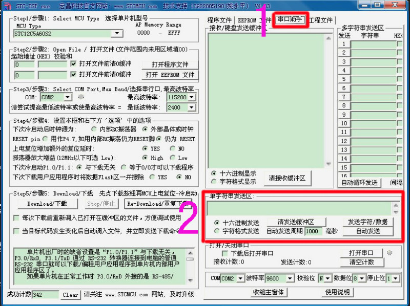 在PC端為單片機寫入的程序的軟件點擊上圖的1。會出現以上界面。上圖的2既是給單片機發送數據的窗口。在輸入框輸入數據后,點擊發送既可以給單片機傳輸數據。
