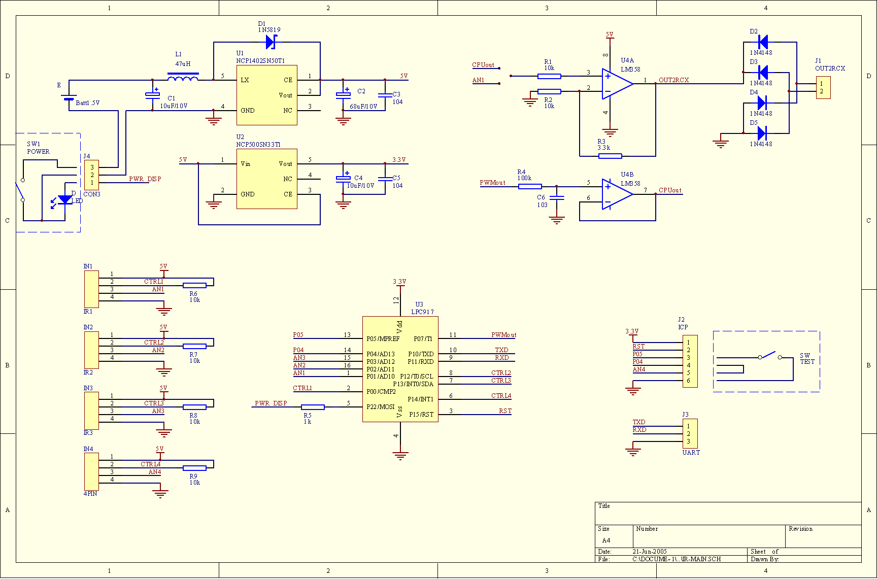 所有的功能均由LPC917 完成,使用其4路AD輸入將采樣器的信號轉換為數字值,經內部軟件處理后,根據結果用PWM方式轉換為模擬量輸出給RCX。